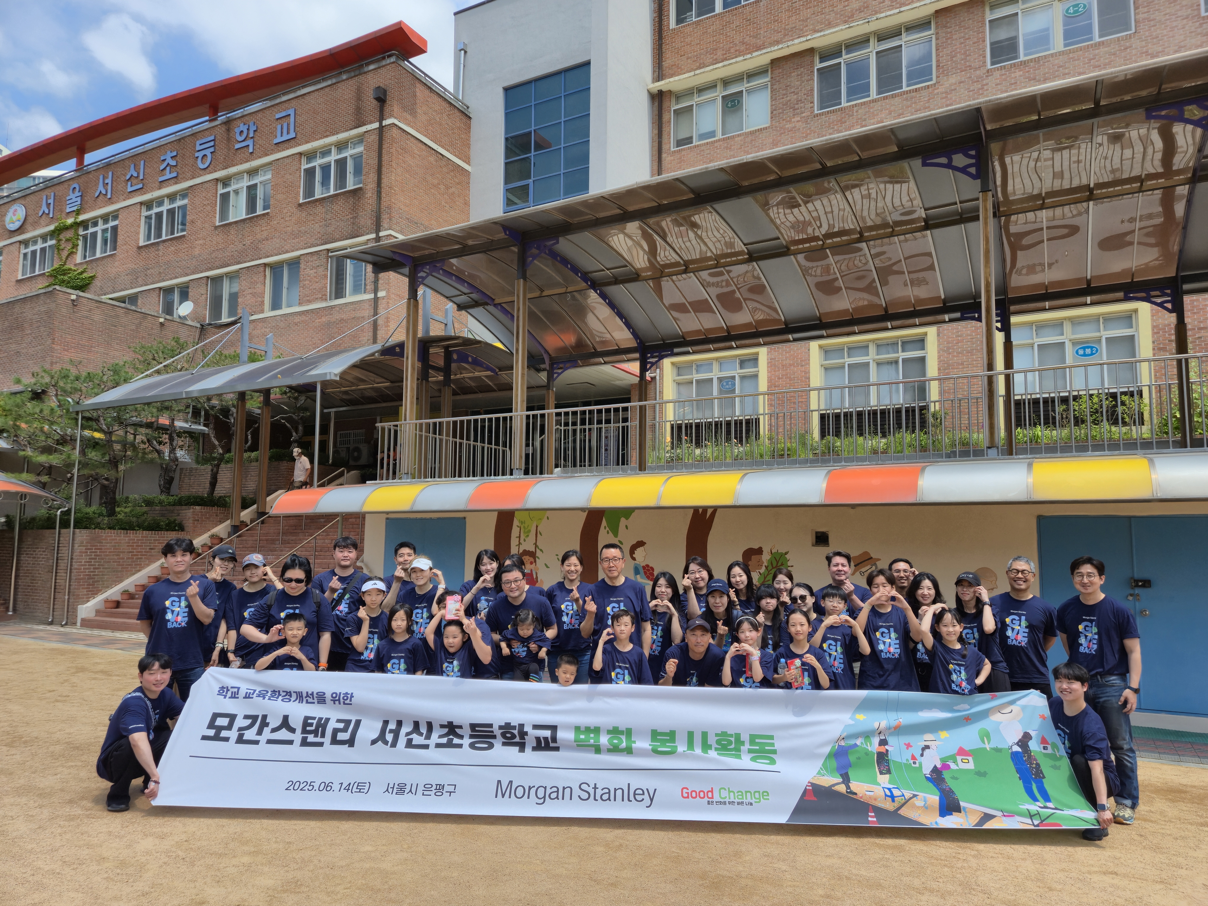 사단법인 좋은변화(이사장 홍민기)는 지난 6월 14일 서울시 은평구에 위치한 서신초등학교에서 모간스탠리 임직원 및 가족들과 함께 벽화 봉사활동을 진행했다고 밝혔다. 이번 봉사활동은 모간스탠리 임직원 및 가족 45명이 참여한 가운데, 학교 교육환경 개선의 목적으로 학교 담장에 벽화봉사를 진행해 아동들에게 쾌적한 학습환경을 제공하였다.